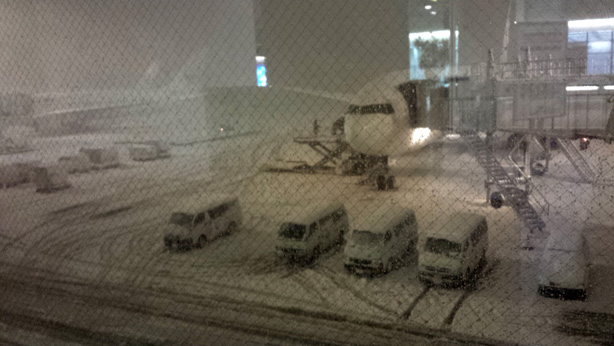 羽田空港は猛吹雪。ただ、そんな中、駐機場には多くのスタッフの方が身を挺して、